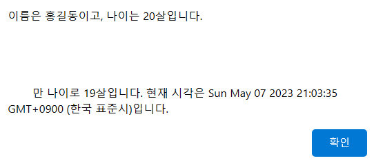 alert(message); //이름은 홍길동이고, 나이는 20살입니다.